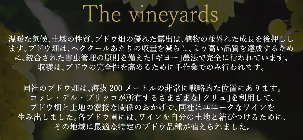 ■発酵・熟成:温度管理された土着酵母のみによる自然発酵の後、ワインは瓶詰めまでステンレスタンクで熟成