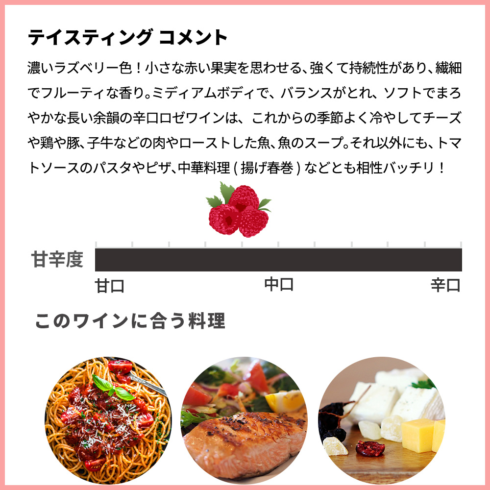 ミディアムボディでバランスが取れており、ソフトでまろやかな長い余韻が楽しめる。特に、チーズや鶏肉、豚肉、子牛肉、ローストした魚、魚のスープ、トマトソースのパスタやピザ、中華料理(揚げ春巻)などと相性が良い。