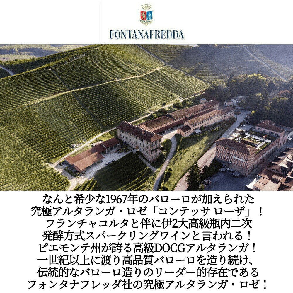 単一年産100%のヴィンテージワインであり、フォンタナフレッダ社の伝統と革新の精神が詰まった高級ロゼ・スパークリングワインだ。