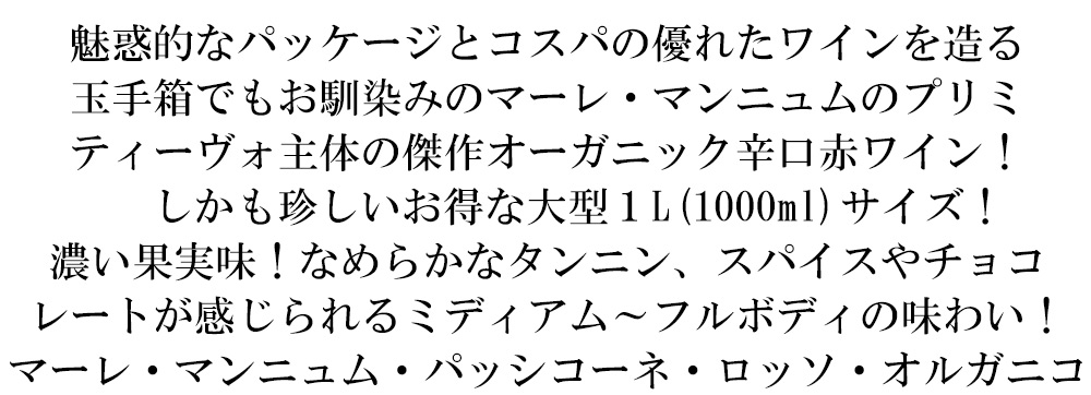 カジュアルに楽しめるスクリューキャップ仕様で、たっぷり1000mlの大型サイズ!豚肉や牛肉のグリルやパスタ、熟成したチーズと良く合います!