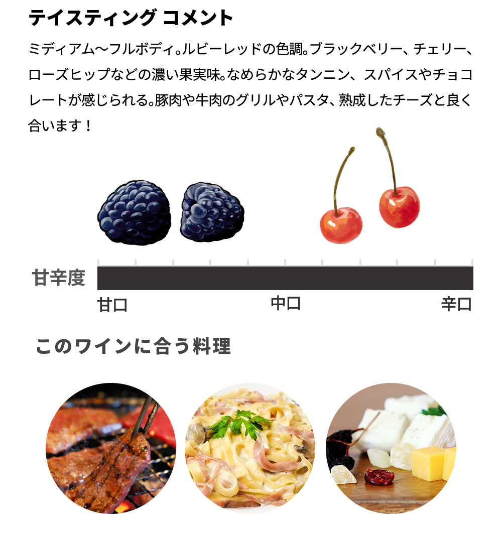 ルビーレッドの色調でブラックベリー、チェリー、ローズヒップなどの濃い果実味。なめらかなタンニン、スパイスやチョコレートが感じられる。