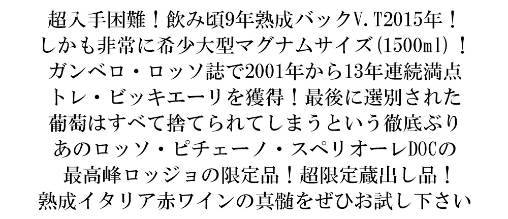 しっとりとした果実の深い味わいとエレガントな深みのある力強さをもつ究極フルボディ辛口赤ワインが超限定でしかも貴重な9年熟成の貴重なバックヴィンテージ[2015]年もので蔵出しの正規品で限定生産の大型マグナムサイズ少量入荷!(若いヴィンテージでも美味しく楽しめるワインですが、9年熟成させることで深みが増し、複雑さとエレガントさが感じられるようになります。熟成イタリア赤ワインの真髄をぜひお確かめいただけましたら幸いです。)