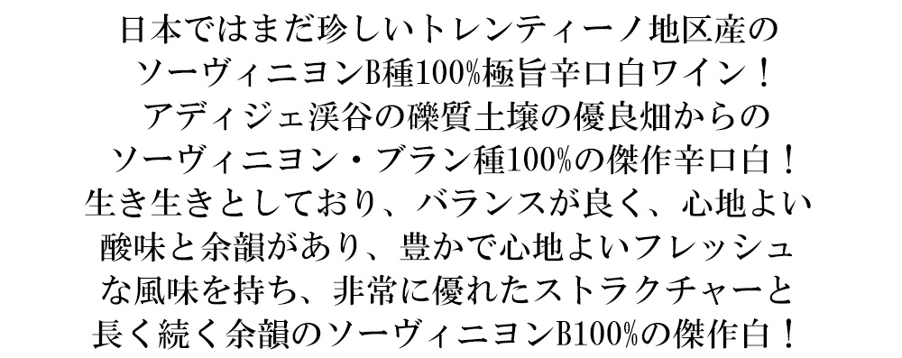 北イタリアは日本ではまだ珍しいトレンティーノ地区産のソーヴィニヨン・ブラン種100%辛口白ワイン!