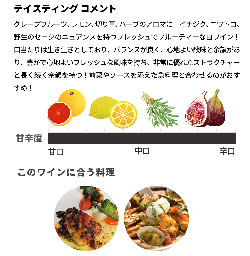 グレープフルーツ、レモン、切り草、ハーブのアロマに イチジク、ニワトコ、野生のセージのニュアンスを持つフレッシュでフルーティーな白ワイン!口当たりは生き生きとしており、バランスが良く、心地よい酸味と余韻があり、豊かで心地よいフレッシュな風味を持ち、非常に優れたストラクチャーと長く続く余韻を持つ!このワインは、前菜やソースを添えた魚料理と合わせるのがおすすめ!サーブする温度8-10度、現地でもレストランで人気の辛口白ワインです!