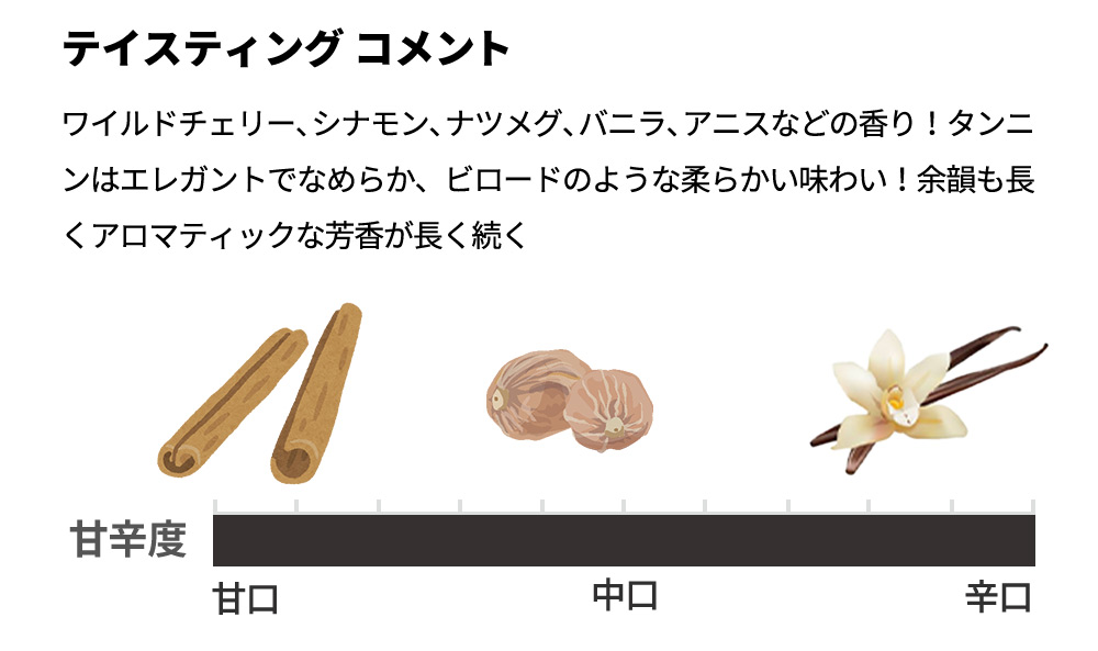 ■発酵・熟成:アルコール発酵とマロラクティック発酵は木樽。フレンチオーク樽で18ヶ月熟成、最低9ヶ月熟成の瓶熟成。