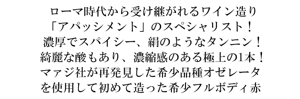 ずばりローマ時代から受け継がれるワイン造り「アパッシメント」のスペシャリスト、マァジ社の高級赤ワイン「トアール」!世界最古の品種のひとつとして知られていたオゼレータ種!