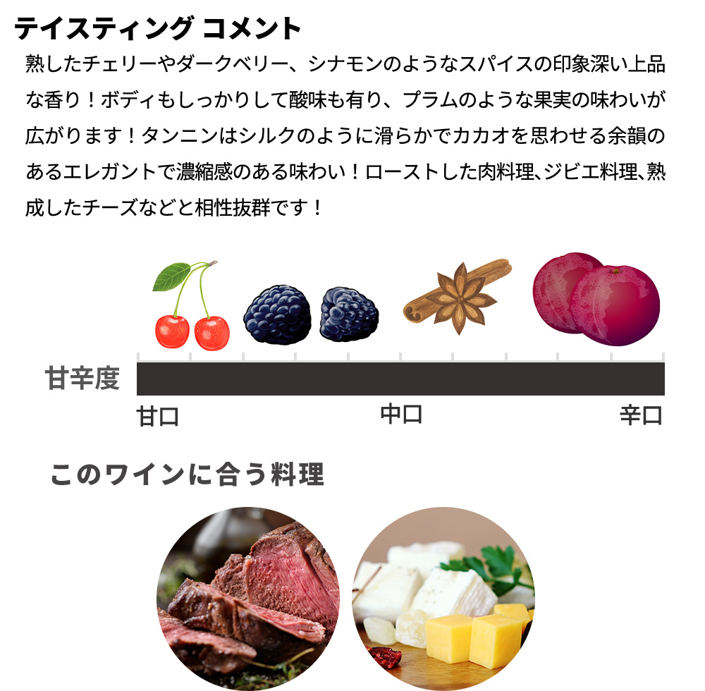 熟したチェリーやダークベリー、シナモンのようなスパイスの印象深い上品な香り!ボディもしっかりして酸味も有り、プラムのような果実の味わいが広がります!タンニンはシルクのように滑らかでカカオを思わせる余韻のあるエレガントで濃縮感のある味わい!