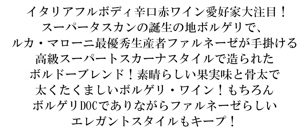 数々のスーパータスカンを世に輩出したトスカーナ州・ボルゲリ地区からルカ・マローニ・ベストワイン年鑑最優秀生産者ファルネーゼが、ついにトスカーナで造り上げる、ボルドー ブレンドで素晴らしい果実味と骨太で太くたくましいボルゲリ・ワイン!