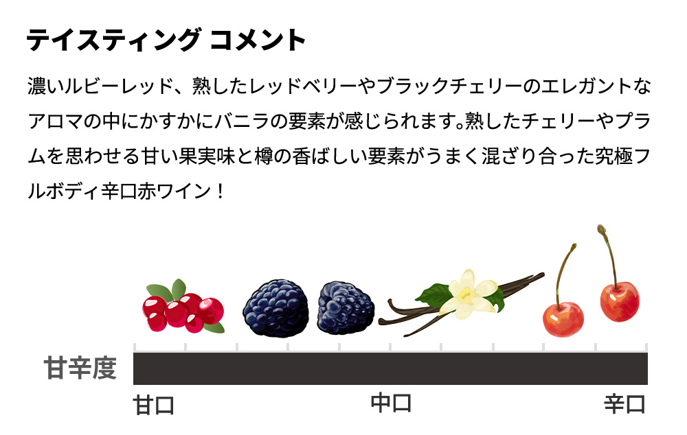 熟したチェリーやプラムを思わせる甘い果実味と樽の香ばしい要素がうまく混ざり合った究極フルボディ辛口赤ワイン!