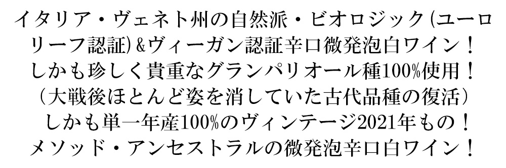 グラパリオールはヴェネトの古いブドウ品種で、ラボサまたはラボシーナ・ビアンカとも呼ばれる。消滅の危機に瀕していたが、幸いにもいくつかのワイナリーが復活させ、現在では健在である。瓶内自然発酵による酵母の存在が、ワインを長い間生き生きとさせ、特徴的なヴェールをかけたような外観を与えている。亜硫酸含有量は非常に低く、残糖はない。
