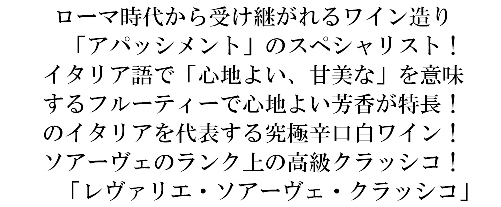 ヴェローナ近郊で産するあまりに有名なヴェネトの人気辛口白ワイン、ソアーヴェのランク上クラッシコ!ソアーヴェといえば、“フルーティーで心地よい芳香”が特長!のイタリアを代表する究極辛口白ワイン!