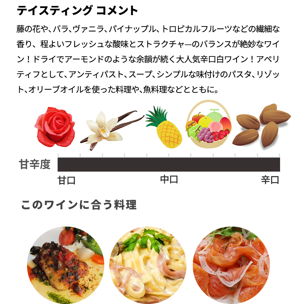 緑色に輝く麦わら色!藤の花や、バラ、ヴァニラ、パイナップル、トロピカルフルーツなどの繊細な香り、程よいフレッシュな酸味とストラクチャ―のバランスが絶妙なワイン!ドライでアーモンドのような余韻が続く大人気辛口白ワイン!マァジ社が誇る大人気レヴァリエ・ソアーヴェ・クラッシコが待望入荷!アペリティフとして、アンティパスト、スープ、シンプルな味付けのパスタ、リゾット、オリーブオイルを使った料理や、魚料理などとともに。