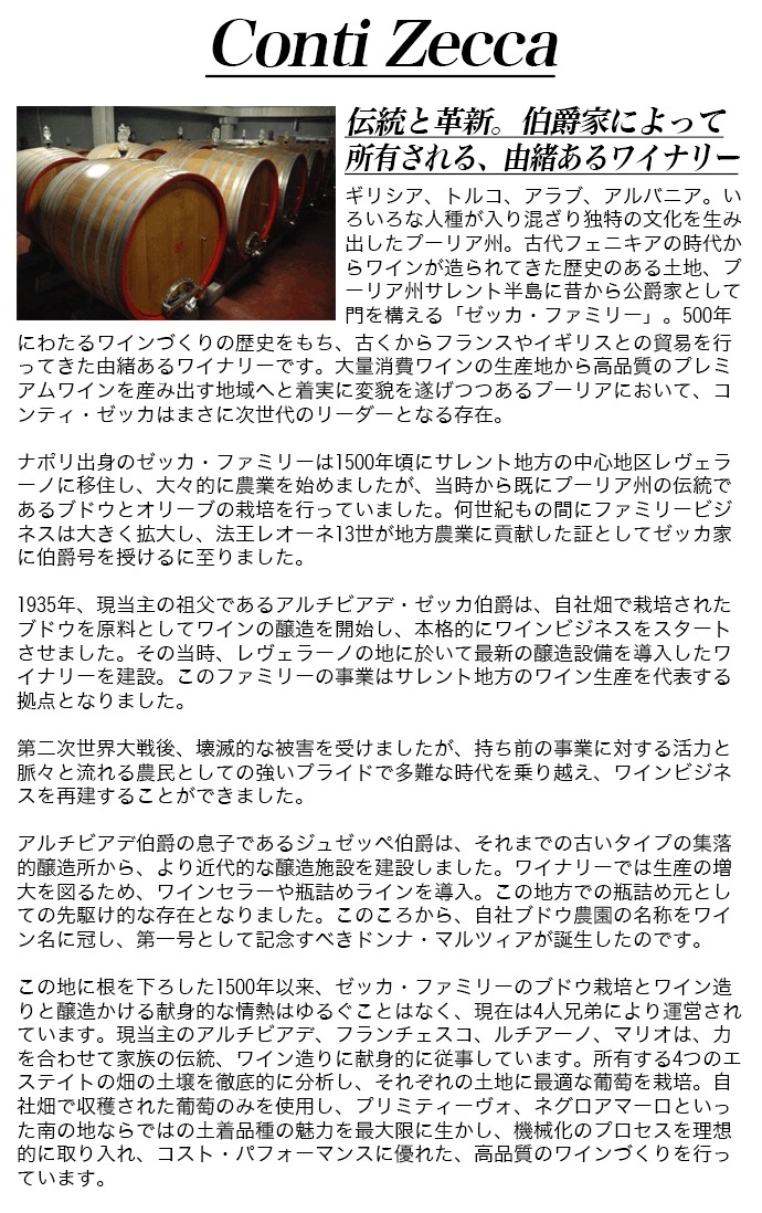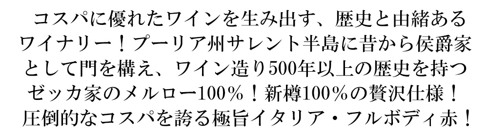 樽熟成の濃厚メルローが遂に登場!しかも新樽100%の贅沢仕様!南イタリアならではの土着品種の魅力を最大限に生かし、コストパフォーマンスに優れたワインを生み出す、歴史と由緒あるワイナリー!