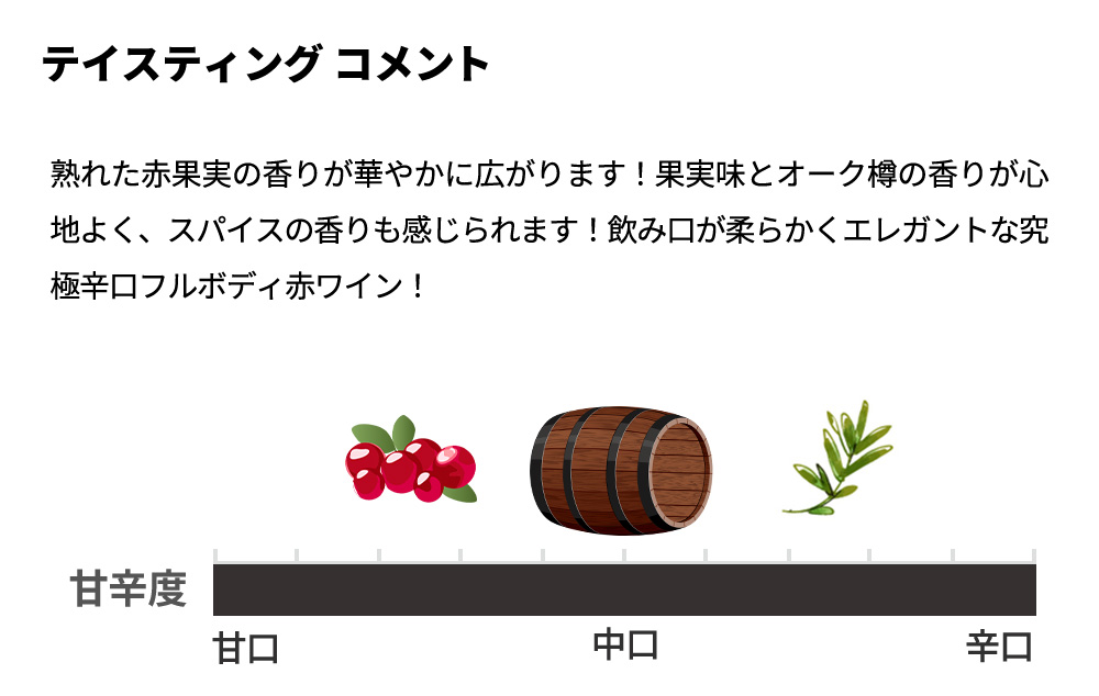 ルビーレッド!熟れた赤果実の香りが華やかに広がります!果実味とオーク樽の香りが心地よく、スパイスの香りも感じられます!飲み口が柔らかくエレガントな究極辛口フルボディ赤ワイン!