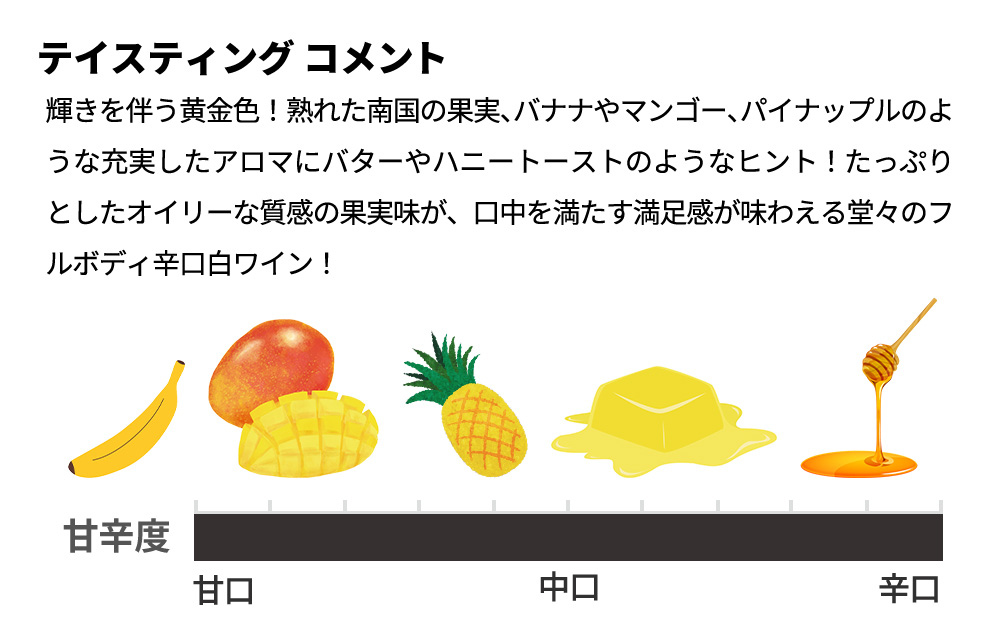 輝きを伴う黄金色!熟れた南国の果実、バナナやマンゴー、パイナップルのような充実したアロマにバターやハニートーストのようなヒント!たっぷりとしたオイリーな質感の果実味が、口中を満たす満足感が味わえる堂々のフルボディ辛口白ワイン!