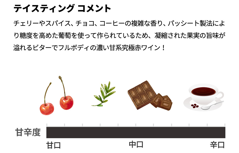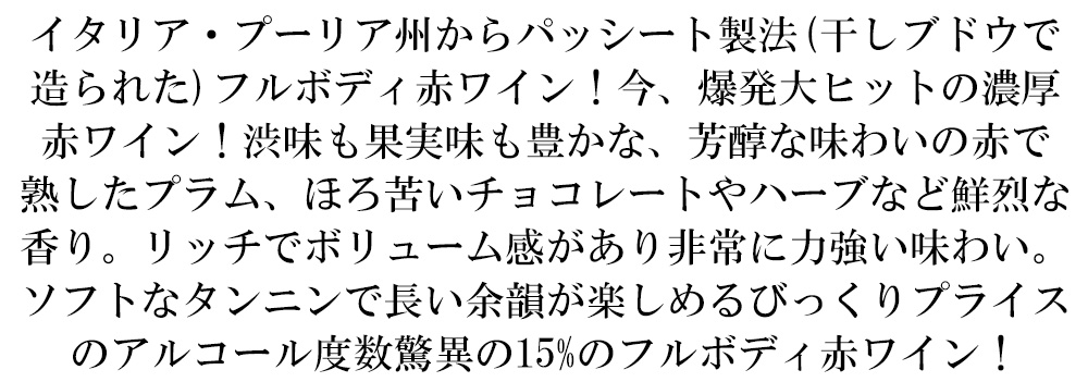 プリミティーヴォ、ネグロアマーロ他を風通しの良い部屋で3か月から6か月ほど陰干しして糖度を高め造られるチェリーやスパイス、チョコ、コーヒーの複雑な香り、パッシート製法により糖度を高めた葡萄を使って作られているため、凝縮された果実の旨味が溢れるビターでフルボディ(アルコール度数驚異の15%)の濃い甘系究極赤ワイン!が正規品でこの円安時に驚異のびっくりプライスで限定入荷!