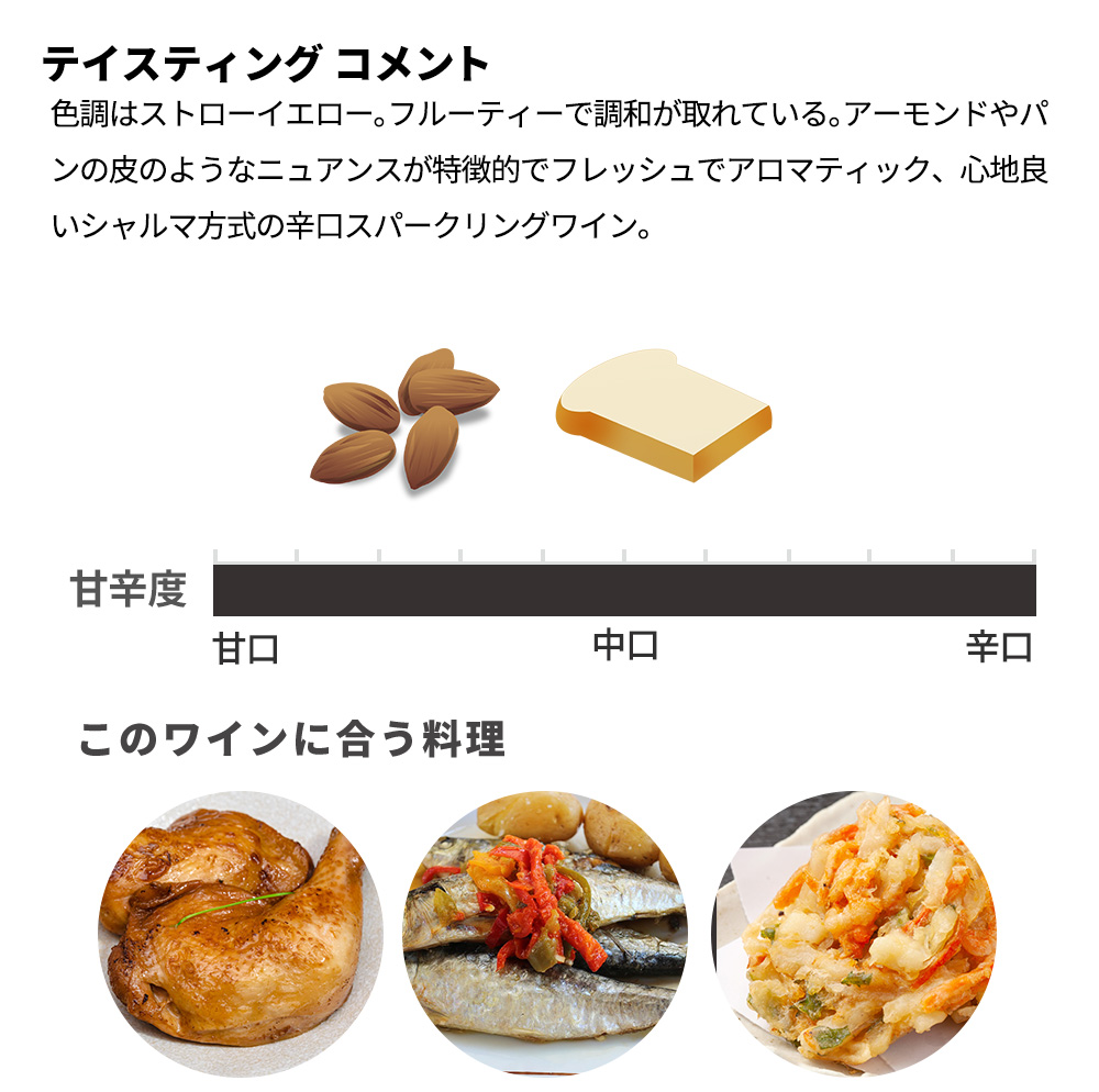 色調はストローイエロー。フルーティーで調和が取れている。アーモンドやパンの皮のようなニュアンスが特徴的でフレッシュでアロマティック、心地良いシャルマ方式の辛口スパークリングワイン。