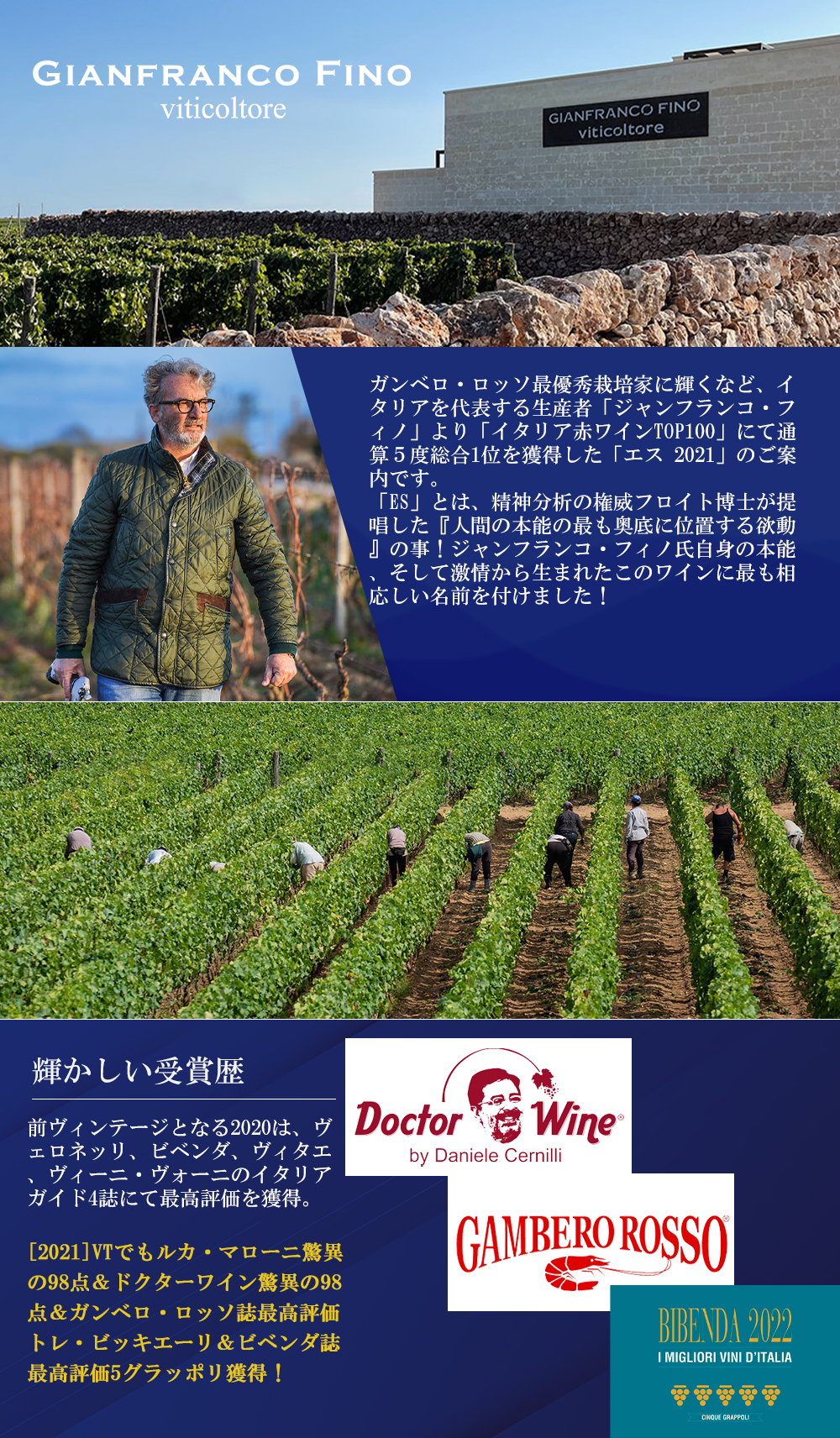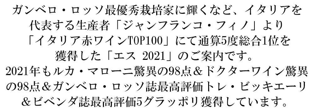 ガンベロ・ロッソ最優秀栽培家に輝くなど、イタリアを代表する生産者「ジャンフランコ・フィノ」より「イタリア赤ワインTOP100」にて通算5度総合1位を獲得した「エス 2021」のご案内です。