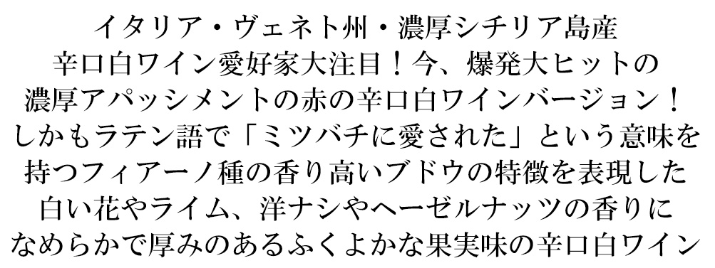 しかも濃厚のアパッシメントより幾分ミディアム寄り造られたビアンコ・ フィアーノ テッレ・シチリアーネ・“アパッシーテ”(アパッシーテとは、イタリア語で「枯れた」を意味する言葉で、ワイン造りにおいては陰干ししたブドウや、そのブドウを使ったワインを指します。アパッシメントとほぼ同じ意味の言葉です。)