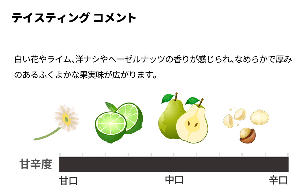 白い花やライム、洋ナシやヘーゼルナッツの香りが感じられ、なめらかで厚みのあるふくよかな果実味が広がります。