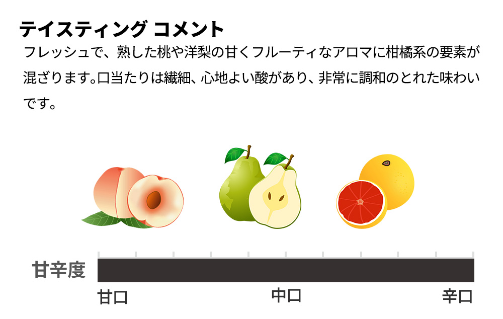 グリーンを帯びた輝きのある淡い麦わら色、フレッシュで、熟した桃や洋梨の甘くフルーティなアロマに柑橘系の要素が混ざります。口当たりは繊細、心地よい酸があり、非常に調和のとれた味わいです。温暖な地域でありながら酸とミネラルを感じさせる見事な白ワインが限定で正規品の素晴らしい状態で少量入荷!