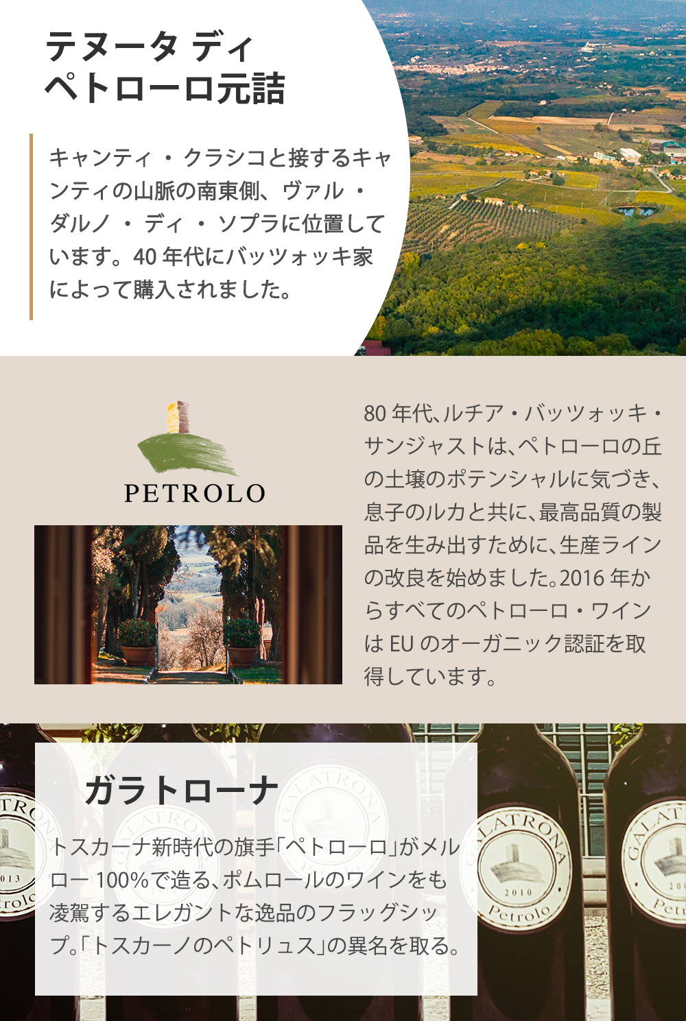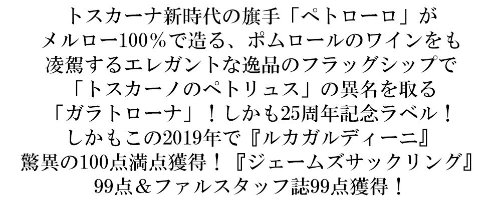 トスカーナ新時代の旗手「ペトローロ」がメルロー100%で造る、ポムロールのワインをも凌駕するエレガントな逸品のフラッグシップで「トスカーノのペトリュス」の異名を取る「ガラトローナ」!
