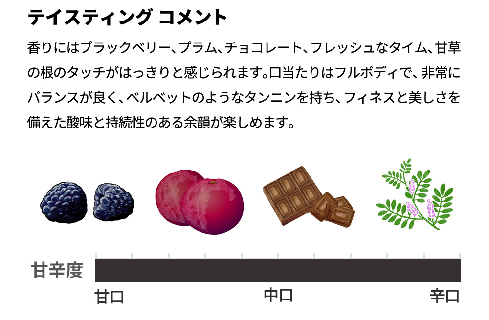 香りにはブラックベリー、プラム、チョコレート、フレッシュなタイム、甘草の根のタッチがはっきりと感じられます。口当たりはフルボディで、非常にバランスが良く、ベルベットのようなタンニンを持ち、フィネスと美しさを備えた酸味と持続性のある余韻が楽しめます。