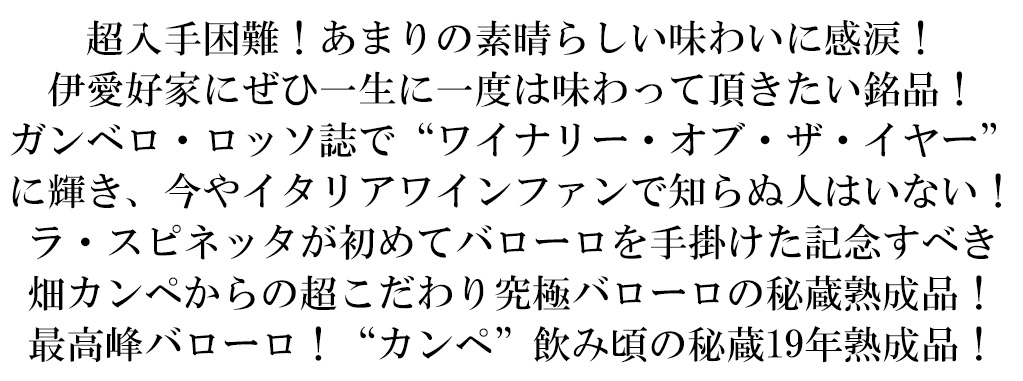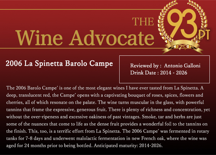 ワインアドヴォケイト誌驚異の93点でコメントは「2006年のバローロ・カンペは、ラ・スピネッタのワインの中で最もエレガントなもののひとつだ。深みのある半透明の赤、カンペはバラ、スパイス、花、チェリーの魅惑的なブーケで幕を開け、そのすべてが味わいの中で共鳴する。グラスの中でワインは逞しくなり、力強いタンニンが表情豊かでたっぷりとした果実味を縁取る。リッチで凝縮感があるが、過去のヴィンテージのような過熟や過度の樽香はない。スモーク、タール、ハーブのニュアンスは、濃密な果実味がフィニッシュのタンニンに素晴らしい箔を与えることで命を吹き込まれるニュアンスのほんの一部に過ぎない。これもラ・スピネッタの素晴らしい取り組みだ。2006年のカンペは、ロータリータンクで7~8日間発酵させた後、フレンチオークの新樽でマロラクティック発酵を行い、瓶詰め前に24ヶ月間熟成させた。」と大注目!