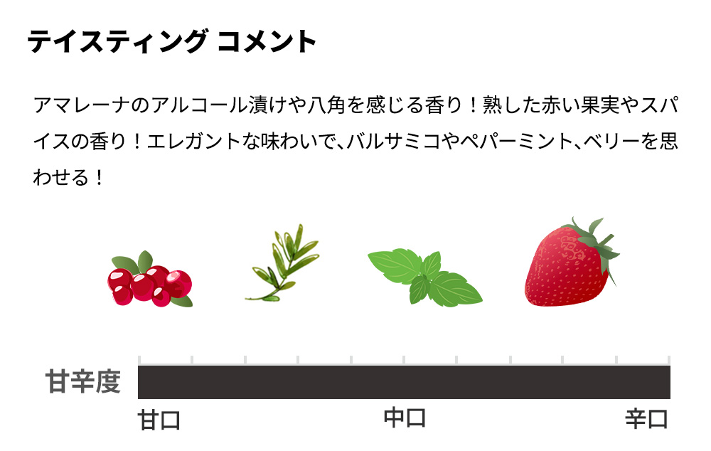 濃いルビー色!アマレーナのアルコール漬けや八角を感じる香り!熟した赤い果実やスパイスの香り!エレガントな味わいで、バルサミコやペパーミント、ベリーを思わせる!凝縮感があり長い余韻には、他の要素とうまく調和するタンニンをしっかりと感じる(バランスのよい樽の味わい、心地よい酸、力強くかつ複雑性に富み、フルーツを感じる余韻は長い。)
