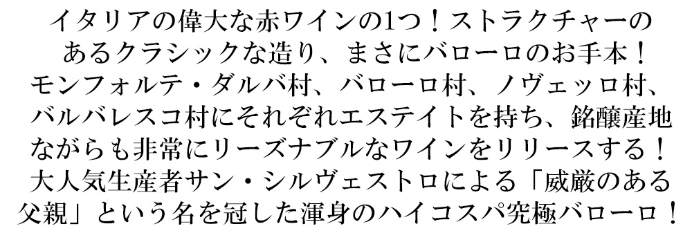 ストラクチャーのあるクラシックな造り、まさにバローロのお手本!イタリアの偉大な赤ワインの1つ!「イタリアワインの王様」として知られるイタリアワイン最高級“バローロ”!