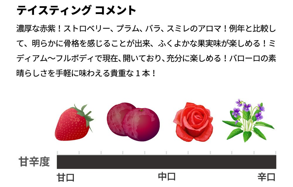 濃厚な赤紫!ストロベリー、プラム、バラ、スミレのアロマ!例年と比較して、明らかに骨格を感じることが出来、ふくよかな果実味が楽しめる!ミディアム~フルボディで現在、開いており、充分に楽しめる!バローロの素晴らしさを手軽に味わえる貴重な1本!高級辛口DOCG規格の偉大なバローロのフルボディ赤ワイン!が素晴らしい品質を誇る大人気ヴィンテージ[2020]年で、待望の少量入荷!