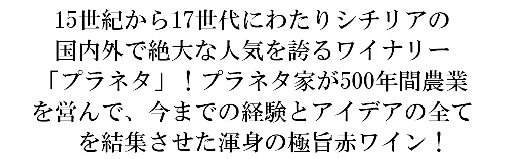 5つの土地に、6つのブティックワイナリーを所有する「ガンベロ・ロッソ」でのトレビッキエーリ獲得数がシチリア州No.1となり名実共にシチリアを代表する造り手となったプラネタ家が誇る愛好家に根強い人気!プラムバーゴはウルモの納屋とブドウ畑周辺の森に育つ、美しい紫色の野生の花の名前から名づけられたワインで、ずばりウルモの土着品種のネロ・ダーヴォラ100%で造られる大人気赤ワイン!