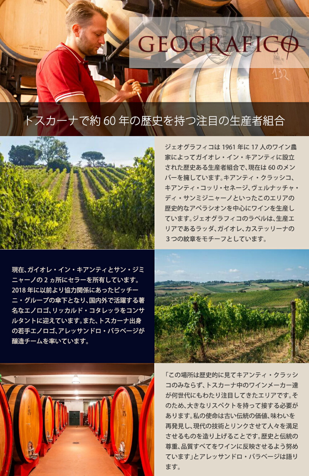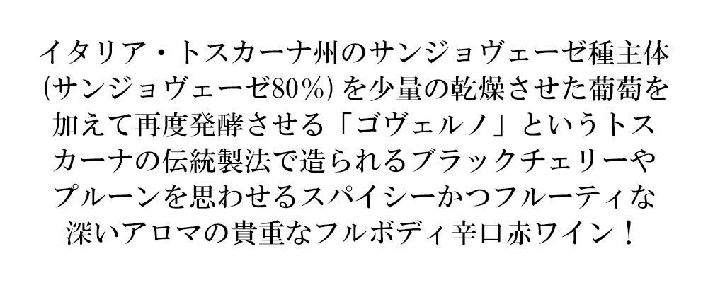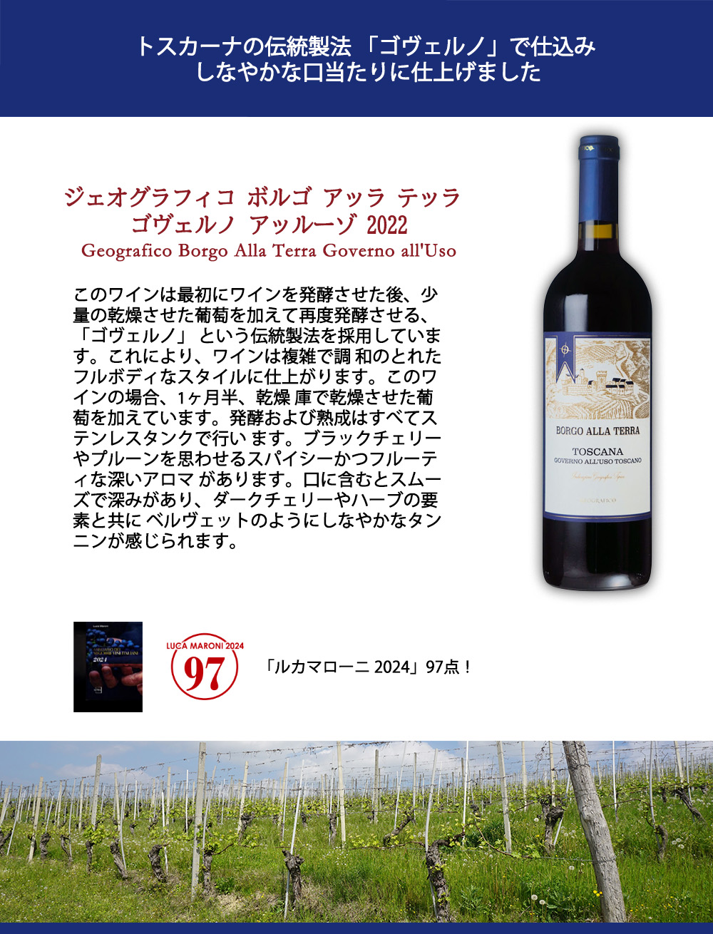このワイン、ジェオグラフィコ ボルゴ アッラ テッラ ゴヴェルノ アッルーゾ[2022]年は土壌は砂と粘土を含む砂利質のサンジョヴェーゼ種主体((サンジョヴェーゼ80%、マルヴァジア ネーラ10%、カナイオーロ10%))で、最初にワインを発酵させた後、少量の乾燥させた葡萄を加えて再度発酵させる、「ゴヴェルノ」という伝統製法を採用しています。