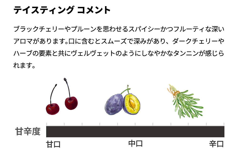 ブラックチェリーやプルーンを思わせるスパイシーかつフルーティな深いアロマがあります。口に含むとスムーズで深みがあり、ダークチェリーやハーブの要素と共にヴェルヴェットのようにしなやかなタンニンが感じられます。フルボディで洗練された味わいを持ちシルキーなタンニンを感じる長い余韻もあります。リッチでしなやかな口当りが魅力