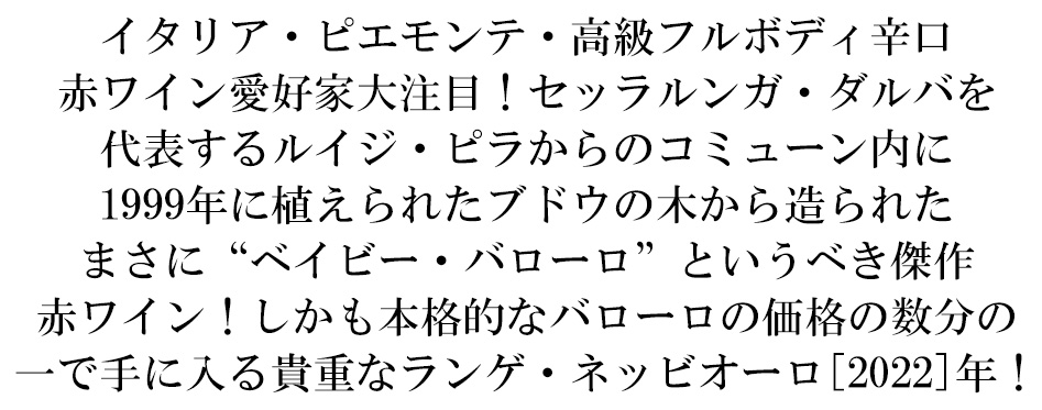 セッラルンガ・ダルバのコミューン内に1999年に植えられた1.5ヘクタールのブドウの木から造られたまさに“ベイビー・バローロ”というべき傑作赤ワイン!