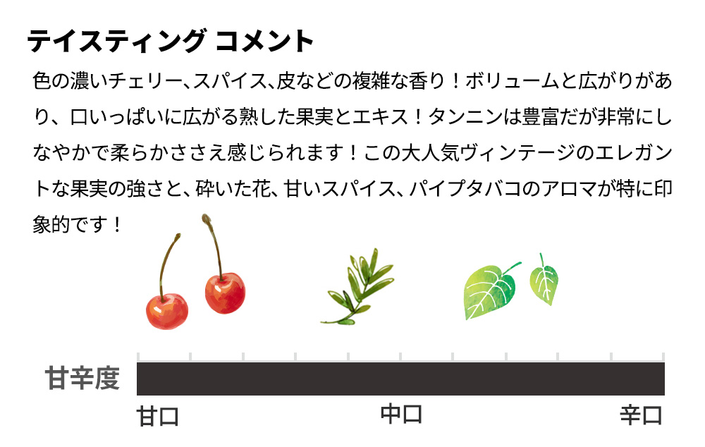 この大人気ヴィンテージのエレガントな果実の強さと、砕いた花、甘いスパイス、パイプタバコのアロマが特に印象的です!この価格帯のワインとしては素晴らしい出来だとおもいます!