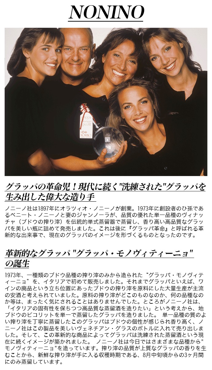 新鮮なモスカートの搾り滓を、温度管理されたステンレスタンクで発酵、蒸留。その後、ステンレスタンクで半年~1年熟成。