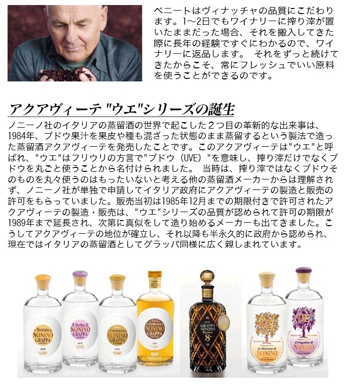 厳選されたシャルドネの搾り滓を蒸留し、バリック(小樽)で12ヶ月熟成させることにより、淡い琥珀色に色づいたシャルドネのグラッパです。
