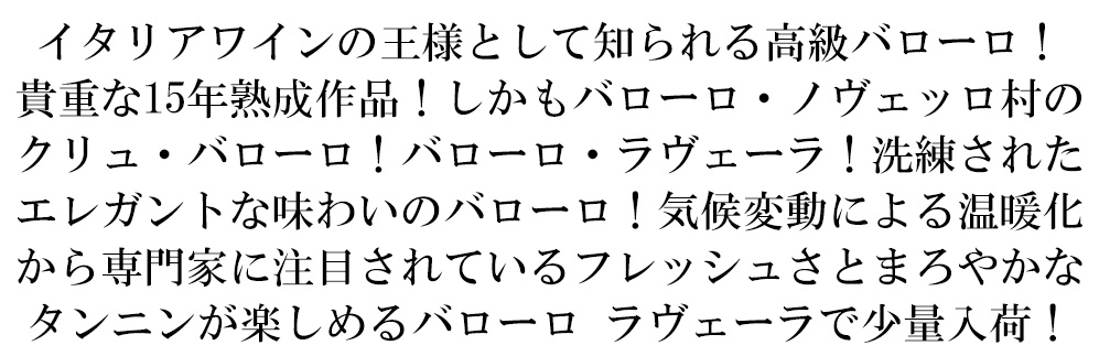 仔牛や鹿のグリル、フォアグラやジビエ料理、癖のあるチーズにも良く合います!程よいタンニン、典型的なクラシックスタイルのバローロが15年の時を経て最高の状態で限定少量入荷!