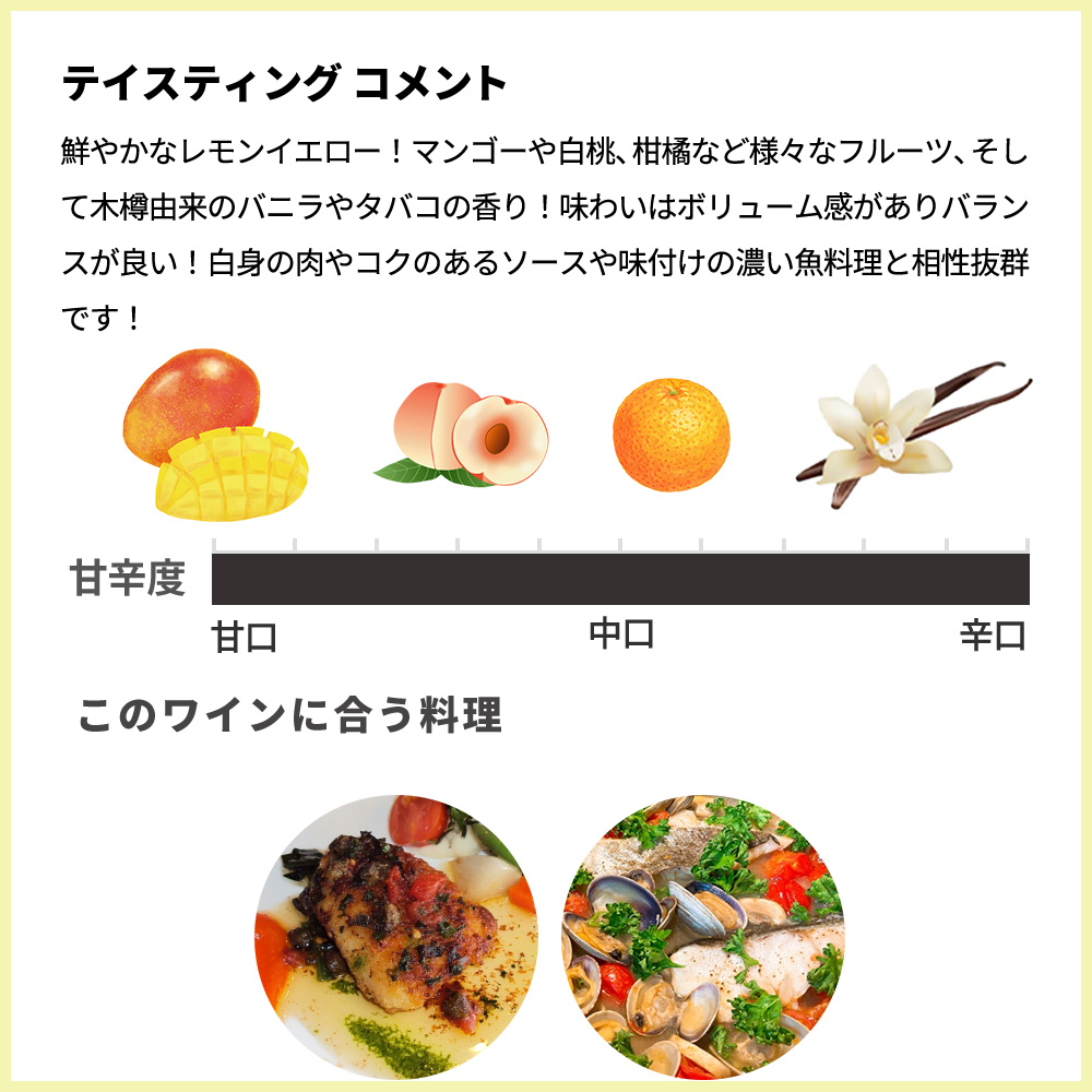 鮮やかなレモンイエロー!マンゴーや白桃、柑橘など様々なフルーツ、そして木樽由来のバニラやタバコの香り!味わいはボリューム感がありバランスが良い!極旨フルボディ辛口白ワインがお洒落な重厚ボトルに入って登場!白身の肉やコクのあるソースや味付けの濃い魚料理と相性抜群です!