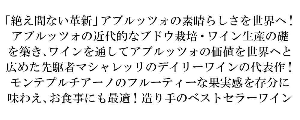 モンテプルチアーノのフルーティーな果実感を存分に味わえて、お食事にも最適なワイン!マシャレリのデイリーワインの代表作であり、世界50カ国以上で愛されるベストセラー!