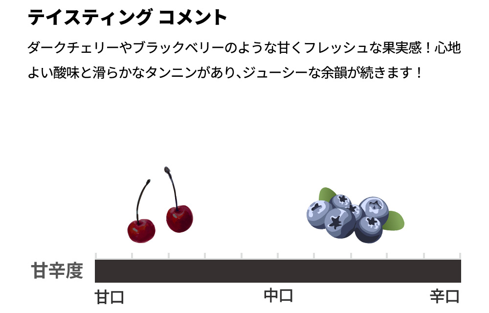 ダークチェリーやブラックベリーのような甘くフレッシュな果実感!心地よい酸味と滑らかなタンニンがあり、ジューシーな余韻が続きます!