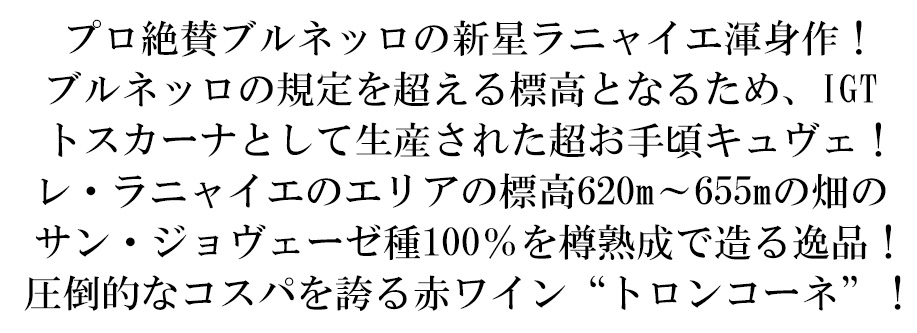 今、話題のレ・ラニャイエの最高コスパワイン“トロンコーネ”が正規品で限定で待望入荷!トマトソースパスタ、赤身肉のステーキ、すき焼きなどと相性抜群!