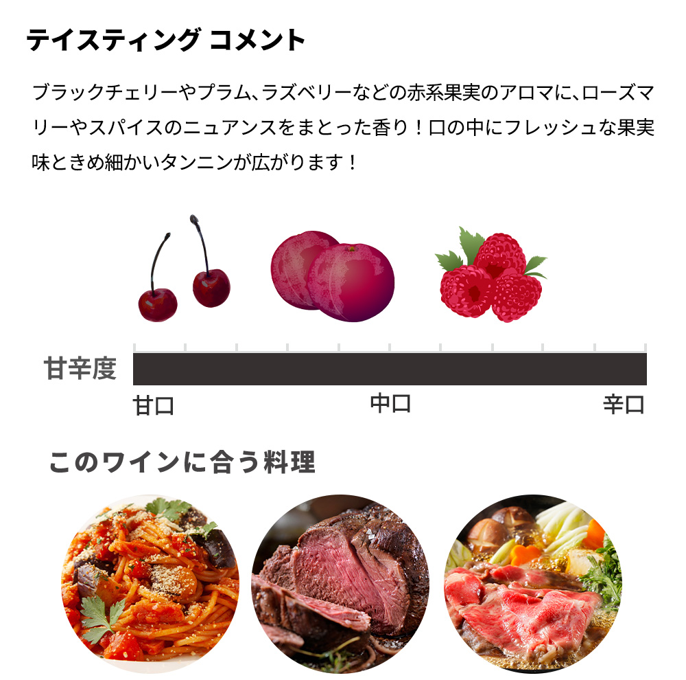 果実味、タンニン、酸のバランスが取れたスタイルが魅力!ブラックチェリーやプラム、ラズベリーなどの赤系果実のアロマに、ローズマリーやスパイスのニュアンスをまとった香り!口の中にフレッシュな果実味ときめ細かいタンニンが広がります!