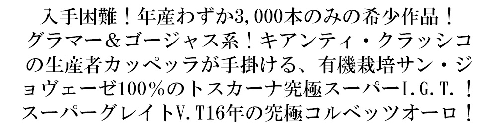 リッチでグラマーな果実味が印象的!深いガーネット色!熟れた黒スグリのジャムやカラメルヴァニラのニュアンスが複雑に絡み合う!満足感のあるフルボディで飲み応えがあり、滑らかでシルキーなタッチ!トスカーナのキアンティにワインアドヴォケイト誌も驚異の97点をつけるスーパーグレイトヴィンテージ2016年を反映した素晴らしい出来栄えを誇る究極フルボディ辛口赤ワイン“コルベッツオーロ”が限定で少量入荷!
