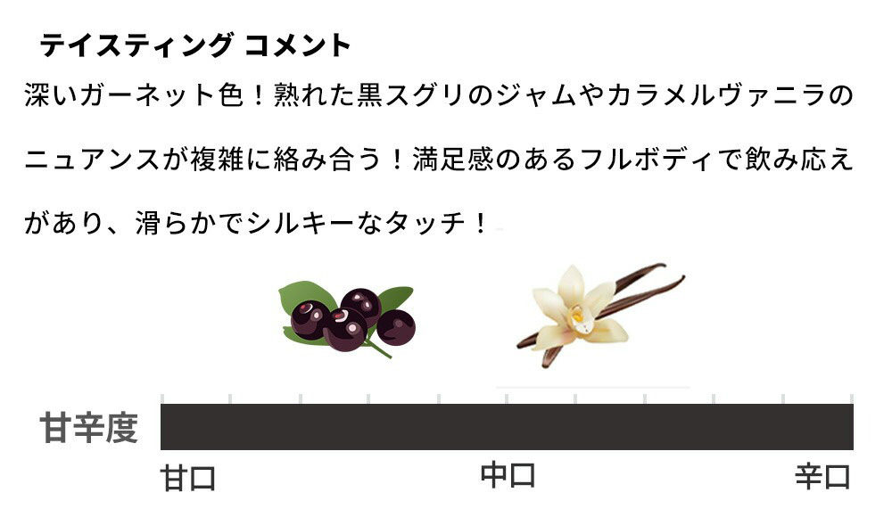 ■発酵・熟成:ステンレスタンク6ヶ月熟成、オーク樽熟成12ヶ月(60%新樽)、瓶熟成36ヶ月以上