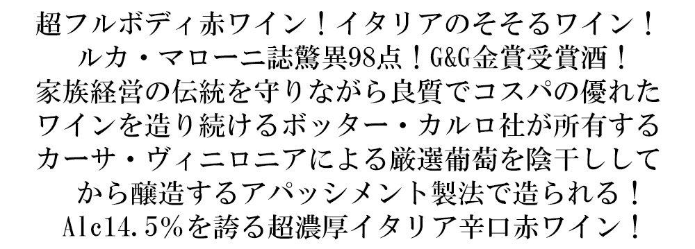 このカ・ヴィットリア・アパッシメント・リミテッド・エディションでルカ・マローニ誌驚異98点獲得!アパッシメントと呼ばれる製法で、干からびるほど過熟させ糖度・凝縮感を上げたブドウ(葡萄の重量が50%になるまで約15日間陰干しを行い糖度を高めた葡萄)ランブルスコ、モンテプルチャーノ、ネグロアマーロ、メルロー、ウーヴァ・ディ・トロイア、サンジョヴェーゼをオーク樽熟成4ヶ月で造られる超濃厚赤ワイン!