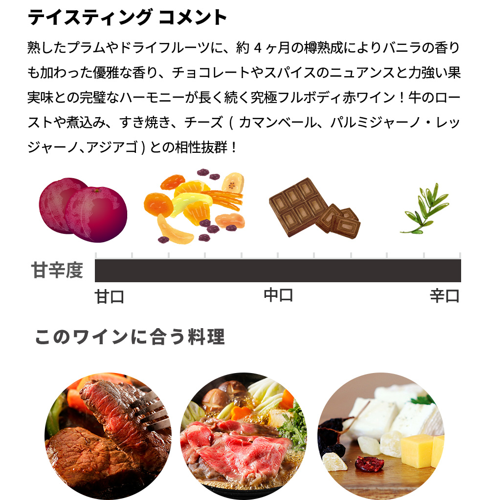 熟したプラムやドライフルーツに、約4ヶ月の樽熟成によりバニラの香りも加わった優雅な香り、チョコレートやスパイスのニュアンスと力強い果実味との完璧なハーモニーが長く続く究極フルボディ赤ワイン、イタリア最高の赤ワインが重厚ボトルで限定少量入荷!牛のローストや煮込み、すき焼き、チーズ(カマンベール、パルミジャーノ・レッジャーノ、アジアゴ)との相性抜群!