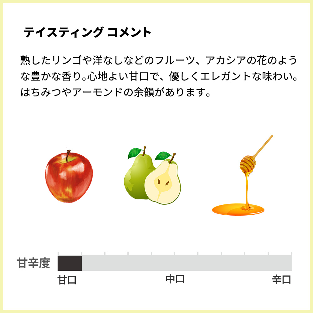 明るい麦わら色。熟したリンゴや洋なしなどのフルーツ、アカシアの花のような豊かな香り。心地よい甘口で、優しくエレガントな味わい。はちみつやアーモンドの余韻があります。