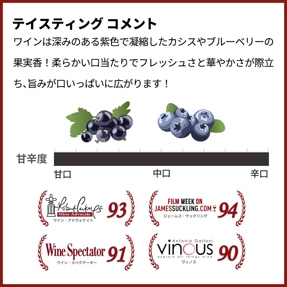 ワインは深みのある紫色で凝縮したカシスやブルーベリーの果実香!柔らかい口当たりでフレッシュさと華やかさが際立ち、旨みが口いっぱいに広がります!